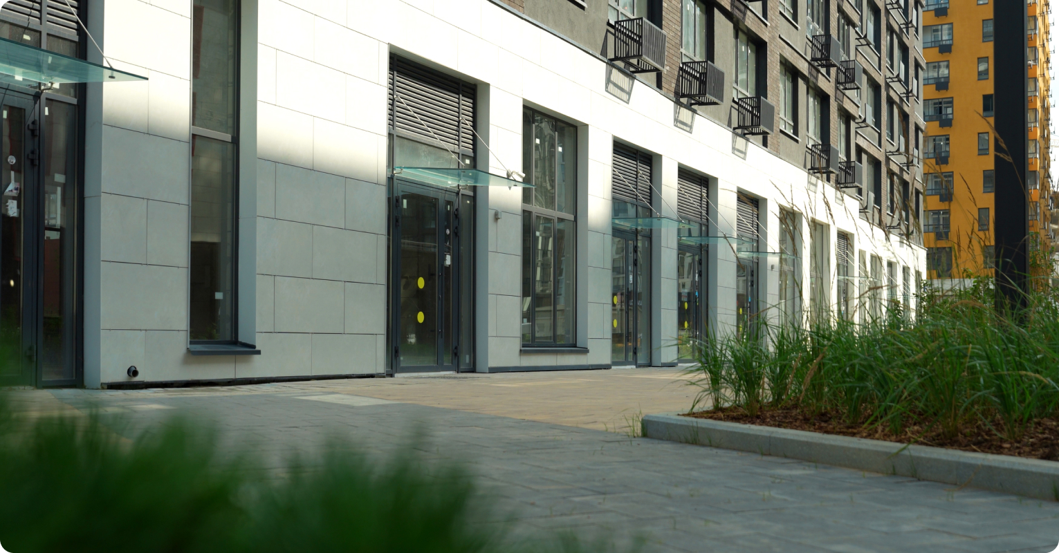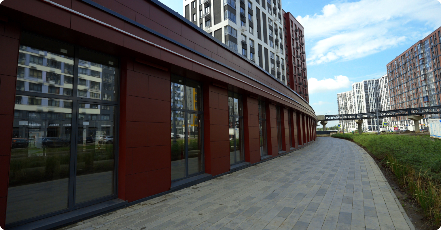 Система идеально подходит для фасадов коммерческих помещений, что и было реализовано в ЖК «Прокшино». Благодаря минимальной видимой ширине и высокой прочности, АЛРОКС 500 создаёт ощущение лёгкости без ущерба для надёжности.