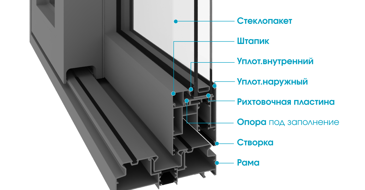 Конструкция основана на тёплом профиле с терморазрывом, соединяющем внутреннее и наружное пространство, и включает двух- или трёхрельсовую направляющую, по которой створка перемещается мягко и бесшумно.